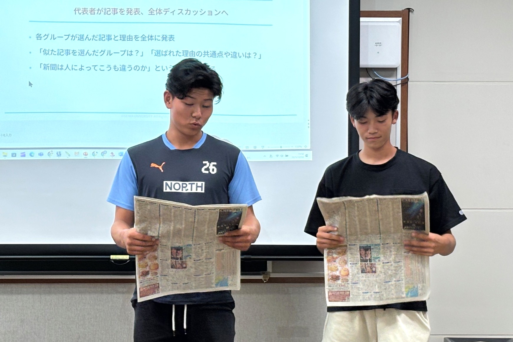 授業「フレッシュマン・セミナーⅡ~ニュースリテラシー実践」では、新聞を使ったアクティブラーニングを行いました。